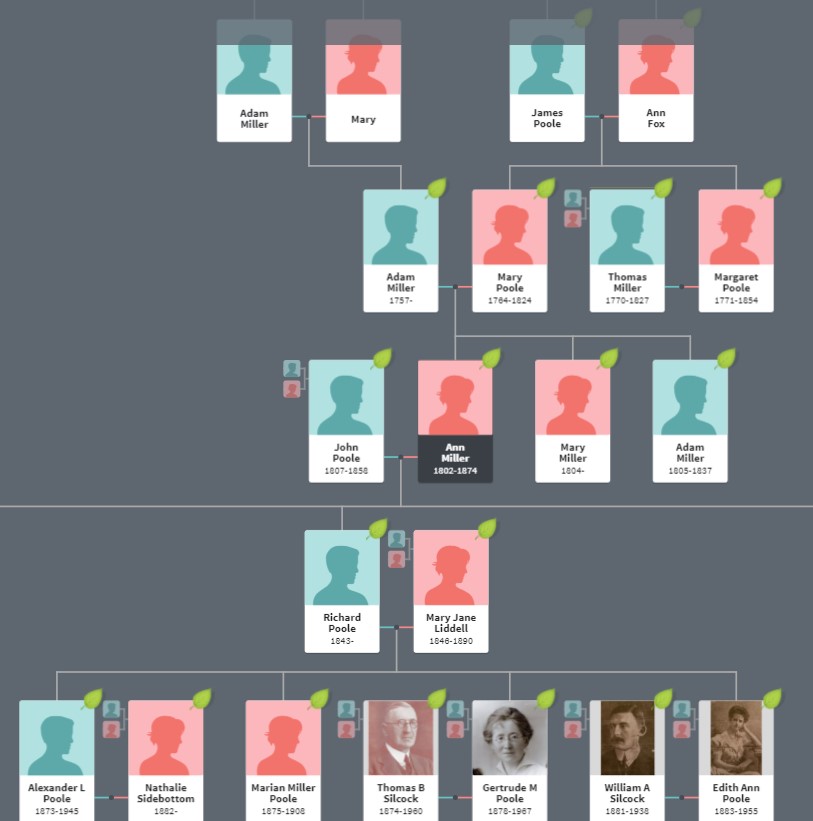 Richard Miller was a yeoman living at Hales Hall until his death in 1785. He had a son Thomas (1770-1827) who rebuilt it in 1803. Thomas married Margaret Poole and had a daughter Ann (1800-1833) who married Alexander Liddell in 1831. Alexander remarried Agnes Pemberton in 1842 after Ann’s death. Thomas also had two sons Richard (1803-1836) and James (1807-1870) who lived at Hales Hall. James inherited from his brother Richard, but by 1851 had moved out to live elsewhere in Out Rawcliffe. My cousin Hannah Bowman was one of his servants in 1851. These surnames Miller, Poole and Liddell seemed vaguely familiar, but I was shocked to find out why when I looked at the ancestry of my cousin Thomas Butler Silcock’s wife Gertrude Mary Poole. His brother William Arnold Silcock also married Gertrude’s sister Edith Ann Poole.