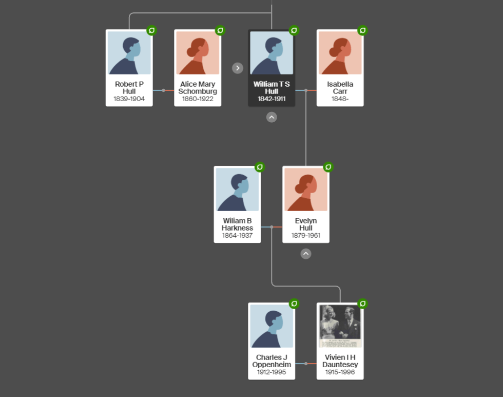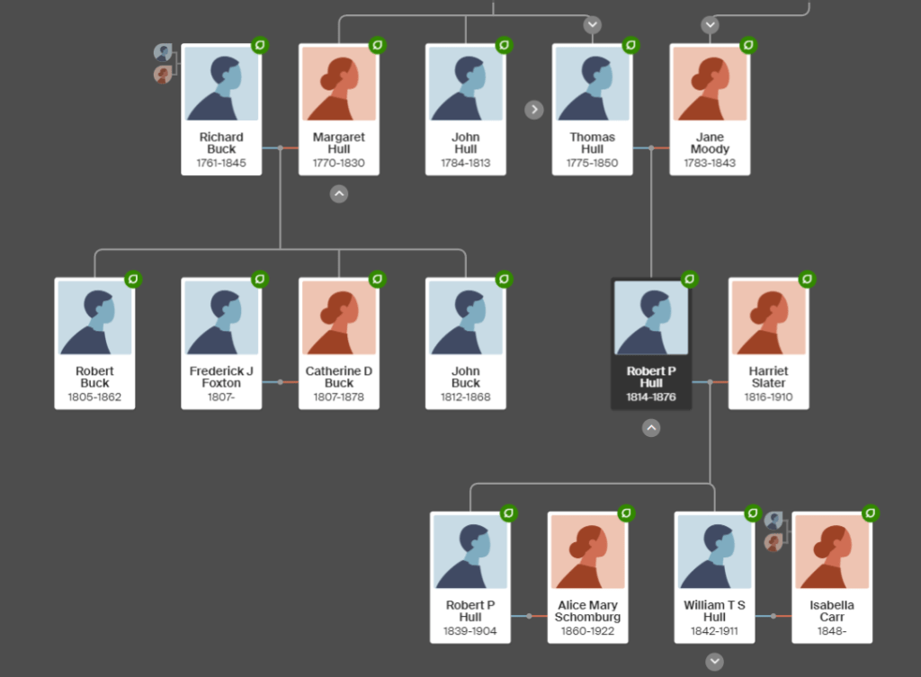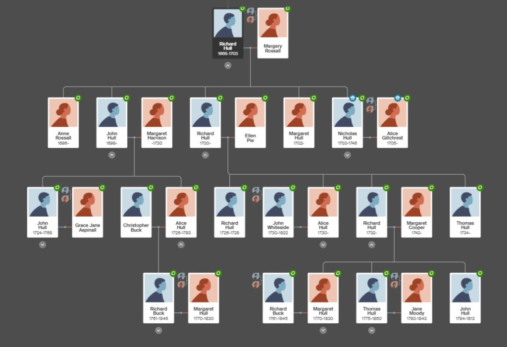 In 1811 John Dauntesey bequeathed the manor to his cousins in a Chorley branch of the Hulls. John Hull died in 1813, leaving it to Rev Richard Buck, who had married John Hull’s sister Margaret Hull (1770-1830). Rev Buck’s mother was Alice Hull (1726-1793). After this came a confusing succession of different owners, some changing their name to Brown or even Dauntesey. What they all had in common was that they were descendants of my ancestors Richard Hull (1668-1703) and Margery Rossall, right down to the last English connection, my 6th cousin once removed Vivien Isobel Harkness Dauntesey (1915-1996) whose mother was Evelyn Hull. Vivien and her husband both adopted the surname Dauntesey. I descend from Nicholas Hull (1703-1746) in the diagram below.