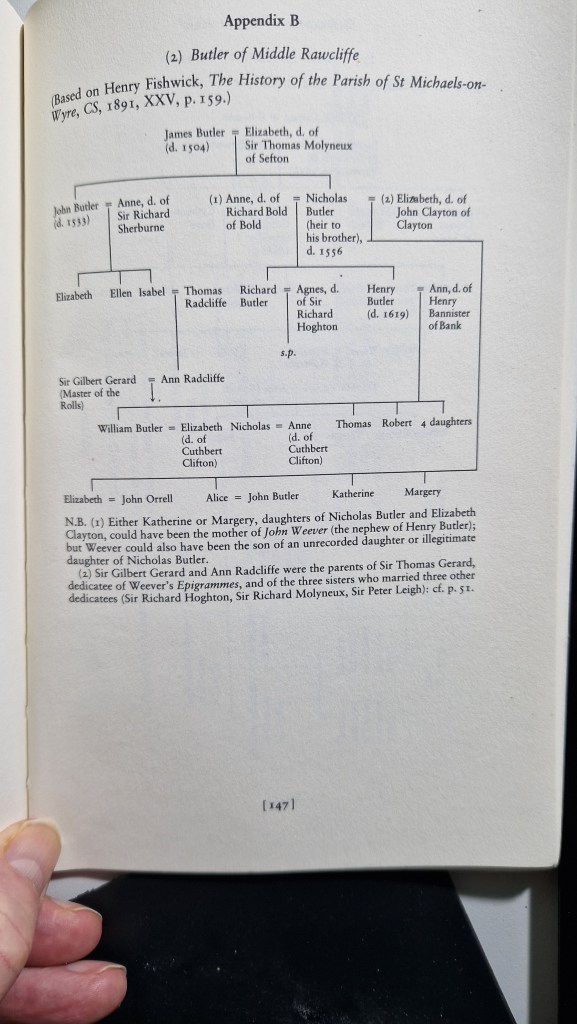 Honigmann’s theory began by establishing the Lancashire connections of John Weever, an antiquarian and poet who published a book Epigrammes in 1599. It contained a sonnet in praise of Shakespeare, written in a new sonnet form that Shakespeare had created but not yet published, indicating that Weever had early access to Shakespeare’s work. Weever dedicated many of his epigrammes to Lancashire gentry, including his uncle Henry Butler.